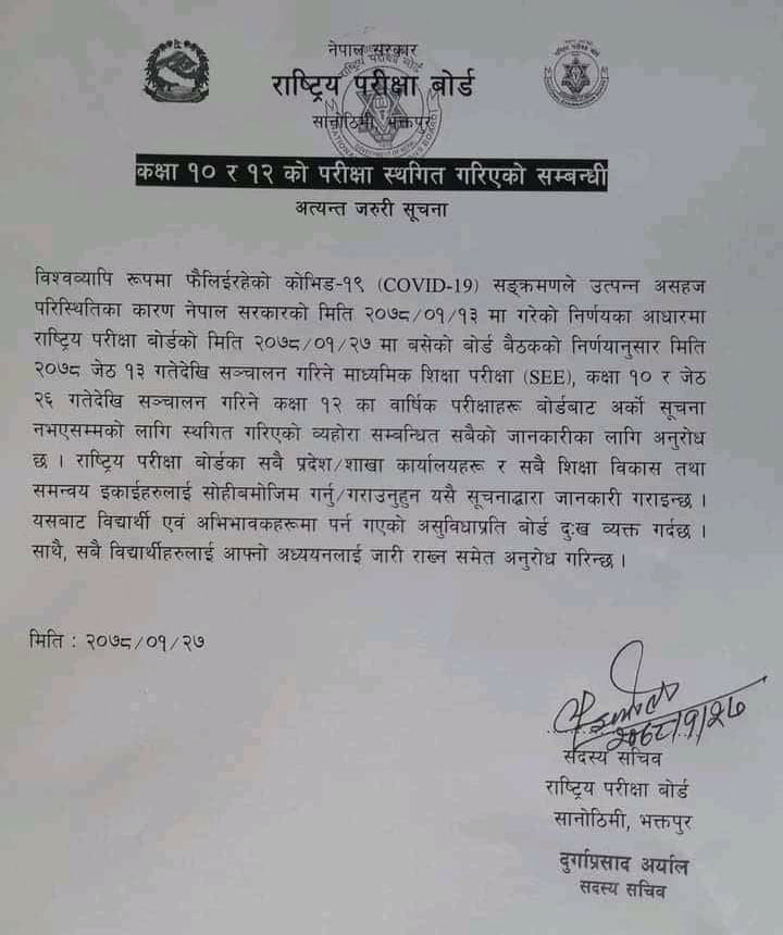 कक्षा १० र १२ को परिक्षा स्थगित बारे